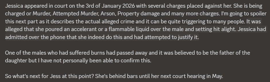 I mean, what is there for me to say? Even with the worst people I covered, there’s some expectation that there are lines even they wouldn’t cross. Someone is dead because of Jessica’s depraved and malicious behavior, and I feel no sympathy for her or what she’s lost because of her horrific actions. I can only offer my deepest and sincerest condolences to the family and friends of the deceased, and anyone harmed in this horrific tragedy.